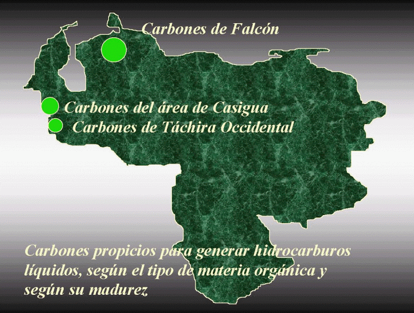 Observaciones que apoyan a los carbones tachirenses como posibles generadoras de crudos, se basan en el carácter esencialmente terrígeno de los menes y crudos detectados en el frente Norandino del Estado Táchira (Tocco et al., 1995). Algunos crudos continentales detectados en Perijá pudiesen tener su origen en los carbones de Guasare (Zulia).