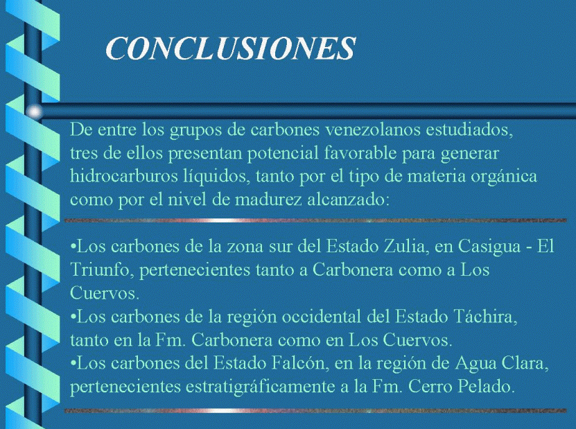 Como se deduce de todo lo anteriormente plasmado, los carbones venezolanos procedentes de Zulia (Fm. Marcelina), Táchira (Fm. Carbonera, Fm. Los Cuervos) y muy en particular Falcón (Fm. Cerro Pelado) lucen con altas perspectivas de haber generado o estar generando hidrocarburos. Si estas rocas lograron expulsar los hidrocarburos generados, entonces es necesario revisar con detenimiento nuevamente estas áreas, sobre todo Falcón y Táchira, y con otra perspectiva realizar estudios prospectivos. Para ello sin embargo, se requiere establecer con mejores criterios y con análisis petrográficos detallados las composiciones macerálicas y geoquímicas de los carbones y litologías adyacentes. Este trabajo, de carácter preliminar, sienta las bases para un estudio mas detallado en las zonas de donde provienen las muestras que arrojaron datos positivos.