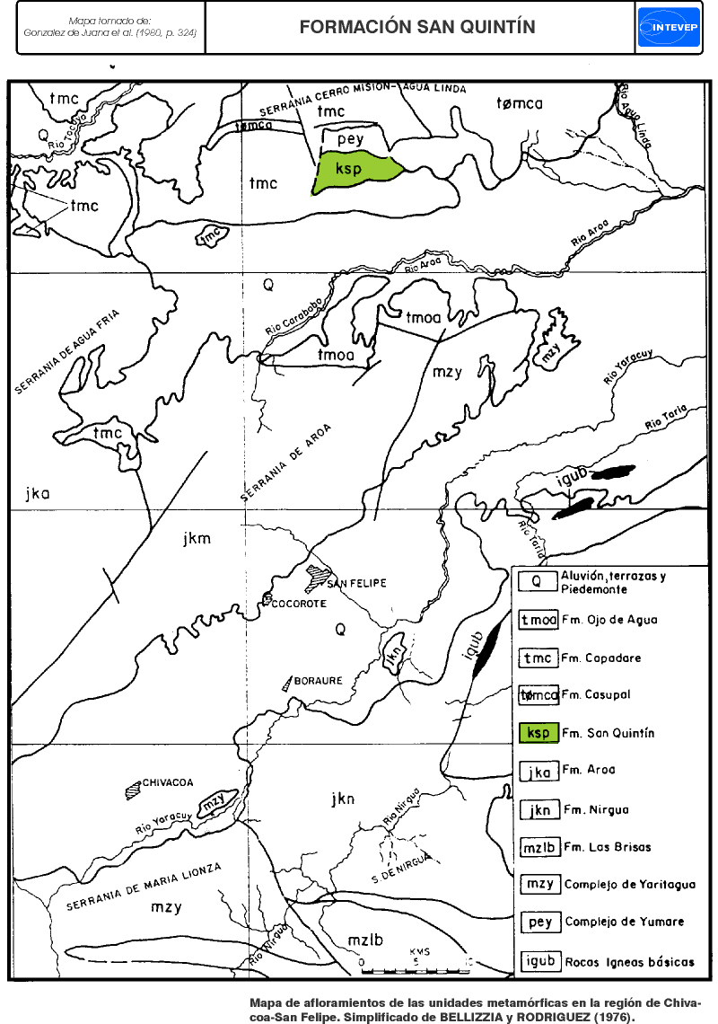 Consideraciones históricas: Bellizzia y Rodríguez (1976, p. 3329) utilizan este nombre para designar una secuencia metavolcánica - metasedimentaria que aflora en el macizo de San Quintín, estado Yaracuy. Descripción litológica: La única descripción de esta Formación es la de sus autores, pero una buena síntesis puede consultarse en González de Juana et al. (1980, p. 329-330). La Formación comprende un conjunto de rocas volcánicas máficas débilmente metamorfizadas y una secuencia metasedimentaria de metaarenisca, metalimolita, filita y escaso metaconglomerado. En algunas localidades las metavolcánicas aparentemente se intercalan a varios niveles con rocas de alto grado metamórfico del Complejo de Yumare; en otras zonas están incluidas en las rocas metasedimentarias. Según Bellizzia y Rodríguez (1976), esta aparente concordancia de las metavolcánicas con las rocas del Complejo de Yumare es de carácter tectónico.