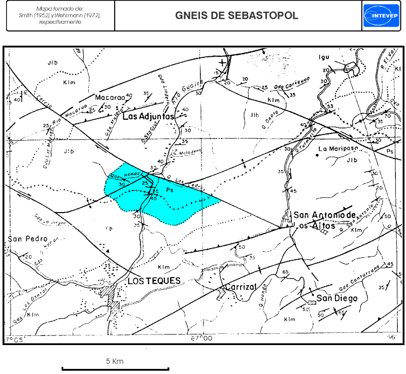 Extesión geográfica: Unicamente se conoce el cuerpo de la localidad tipo, de unos 5 por 1,5 km (Smith, 1952). Dengo (1951) y Wehrmann (1972) también cartografían con este nombre al cuerpo de Los Lechosos - La Mariposa, que actualmente se ha separado y se conoce como "Para-gneis de La Mariposa" (Pimentel et al., 1985; Urbani, 1989).