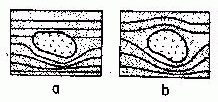 ![]() | Indentación de guijarrosCuando la matriz se arquea alrededor de un solo lado de un guijarro encajado, este es el fondo original (a). La indentación aparente de sedimentos laminados por encima y por debajo de un guijarro encajado puede resultar de la compactación o compresión subsecuente de los sedimentos (b). |