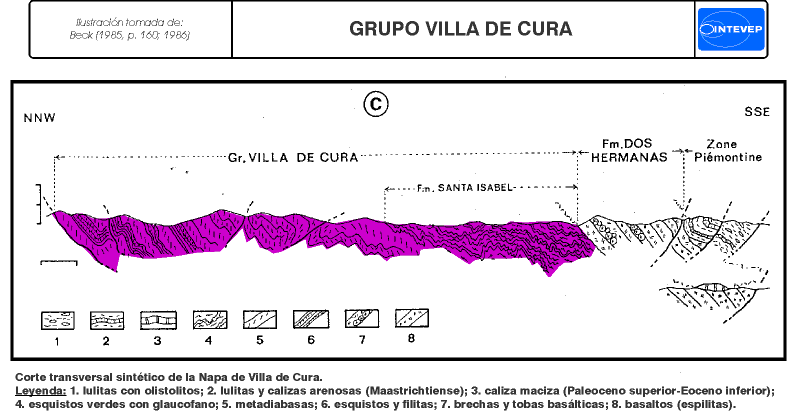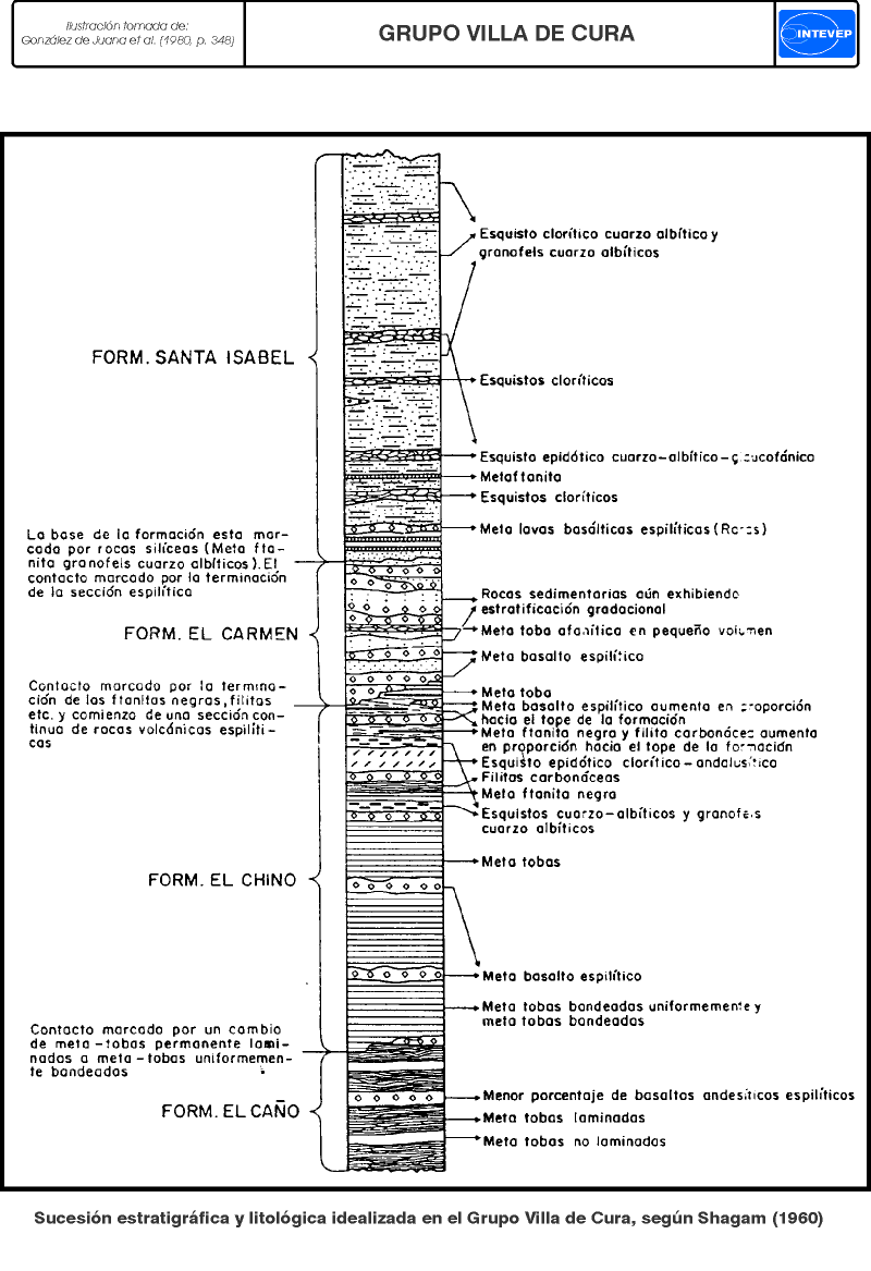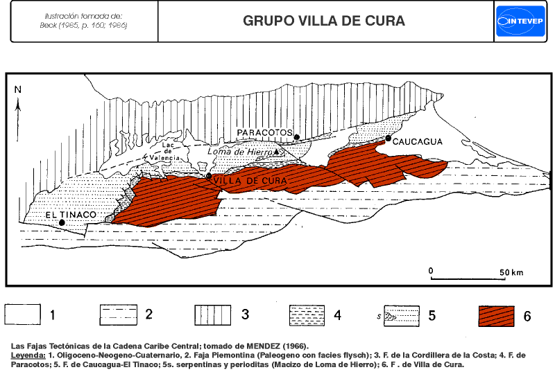 Consideraciones históricas: Aguerrevere y Zuloaga (1937) introdujeron el nombre Serie de Villa de Cura para designar una asociación compleja de rocas mayoritariamente metavolcánicas expuestas en las cercanías de Villa de Cura, estado Aragua. Posteriormente los mismos autores (1938) la formalizan como Grupo, integrado por sus formaciones Charallave y Villa de Cura. Shagam (1960) redefine el Grupo Villa de Cura, dividiéndolo en las formaciones El Caño, El Chino, El Cármen y Santa Isabel. Muchos autores posteriores han contribuido al conocimiento del Grupo Villa de Cura, tanto en su cartografía geológica, como con información petrológica, geoquímica y estructural, así mismo ha sido el tópico de una interesante polémica sobre su origen (aloctonía vs. autoctonía), entre ellos citaremos a Beccaluva et al., 1995; Beck, 1985, 1986; Beets et al., 1984; Bellizzia, 1986; Bellizzia et al., 1976; Girard, 1981; Girard et al., 1982; González de Juana et al., 1980; González y Picard, 1971, 1972; Jarvis, 1966; Konigsmark, 1965; Lar, 1992; Loubet et al., 1980, 1985; Navarro, 1983, 1985-a, b; Ostos y Navarro, 1986; Navarro et al., 1987, 1988; Oxburgh, 1965; Piburn, 1968; Sagna et al., 1988; Seiders, 1965; Shagam, 1960; Smith, 1952; Urbani et al., 1990 y Urbani, 1991.